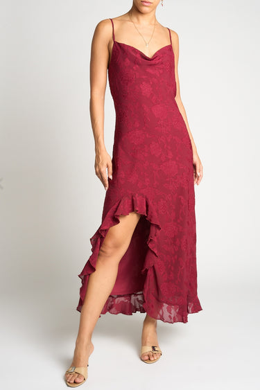 BROCADE BIAS DRESS WITH RUFFLE HEM